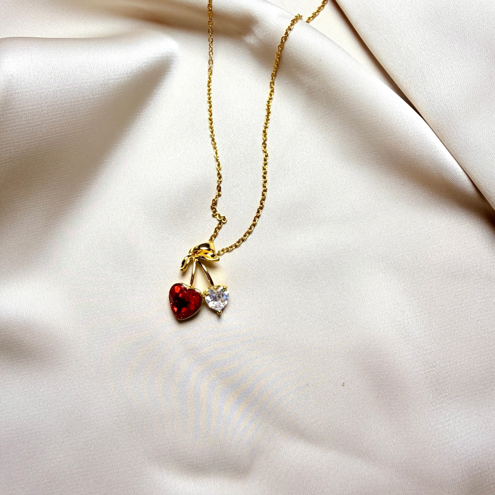 Collar dorado con dije de cerezas con cristales rojos y transparentes .